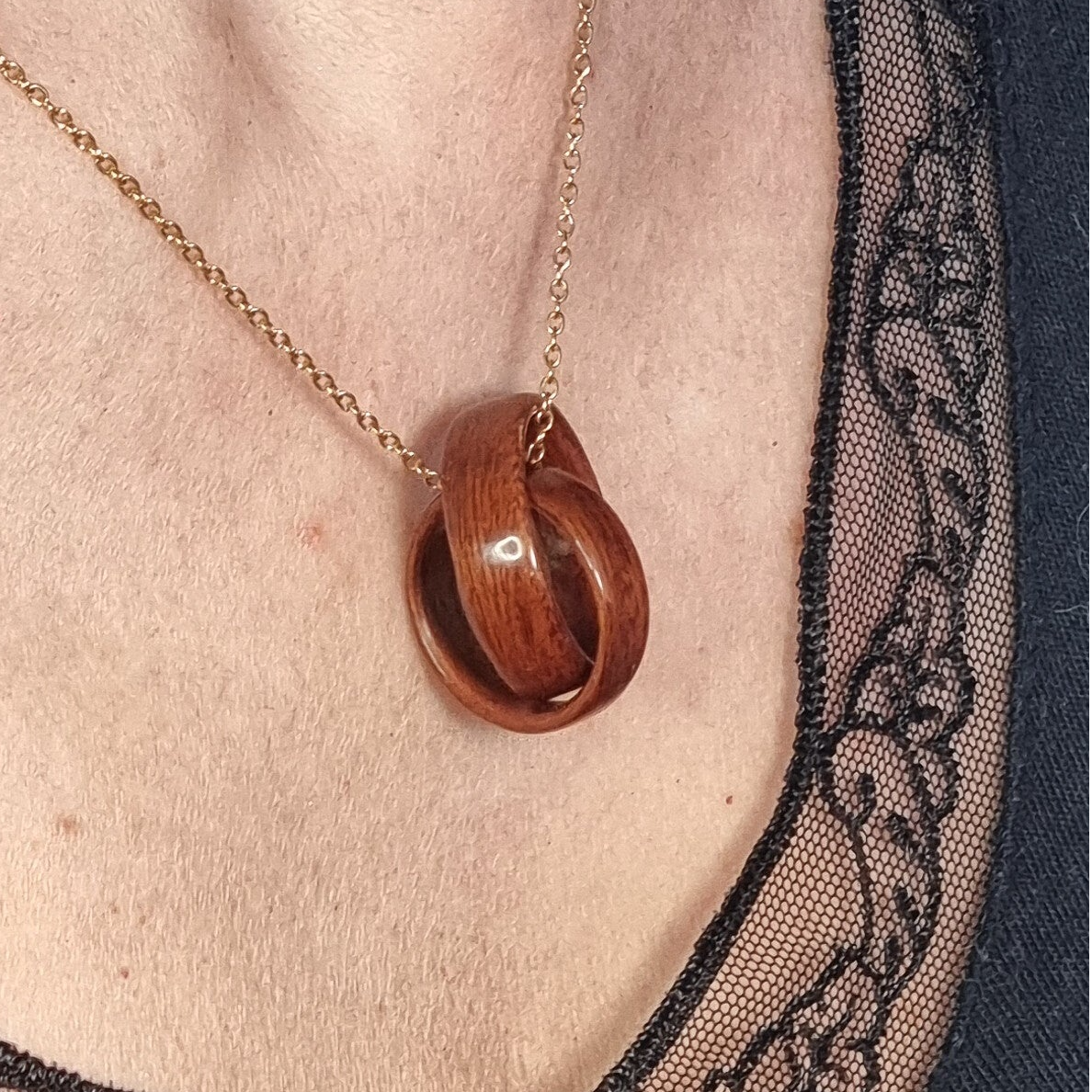 Ce pendentif est fait de deux alliances entrelacées, symbole d'un lien indéflectible. Il est façonné à la main dans du palissandre, un bois précieux réputé pour ses nuances profondes et son veinage unique. Le chois de l'assence renforce la symbolique d'un couple fait pour durer : le palissandre est traditionnellement offert pour les 65 ans de mariage.
