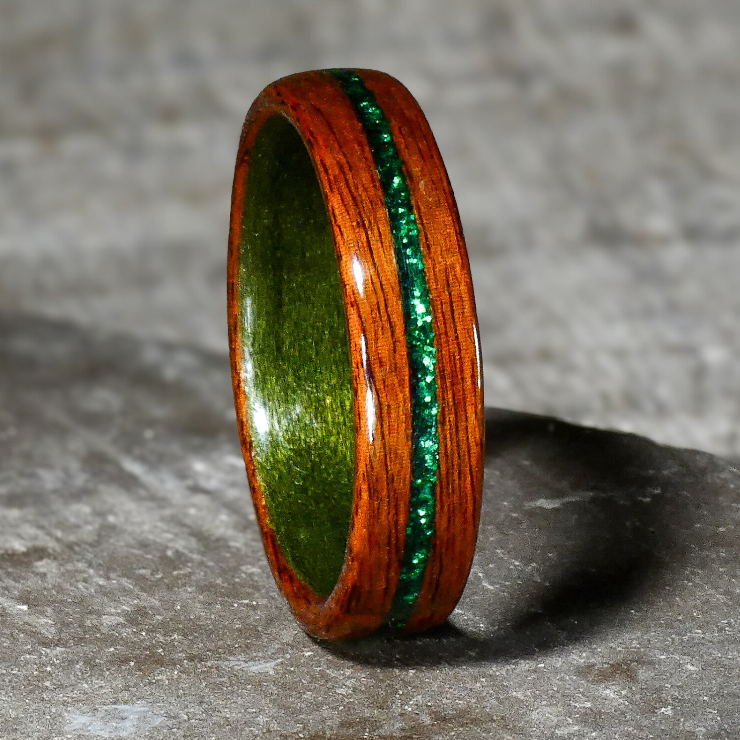 La bague verte en bois de palissandre et ses paillettes émeraude